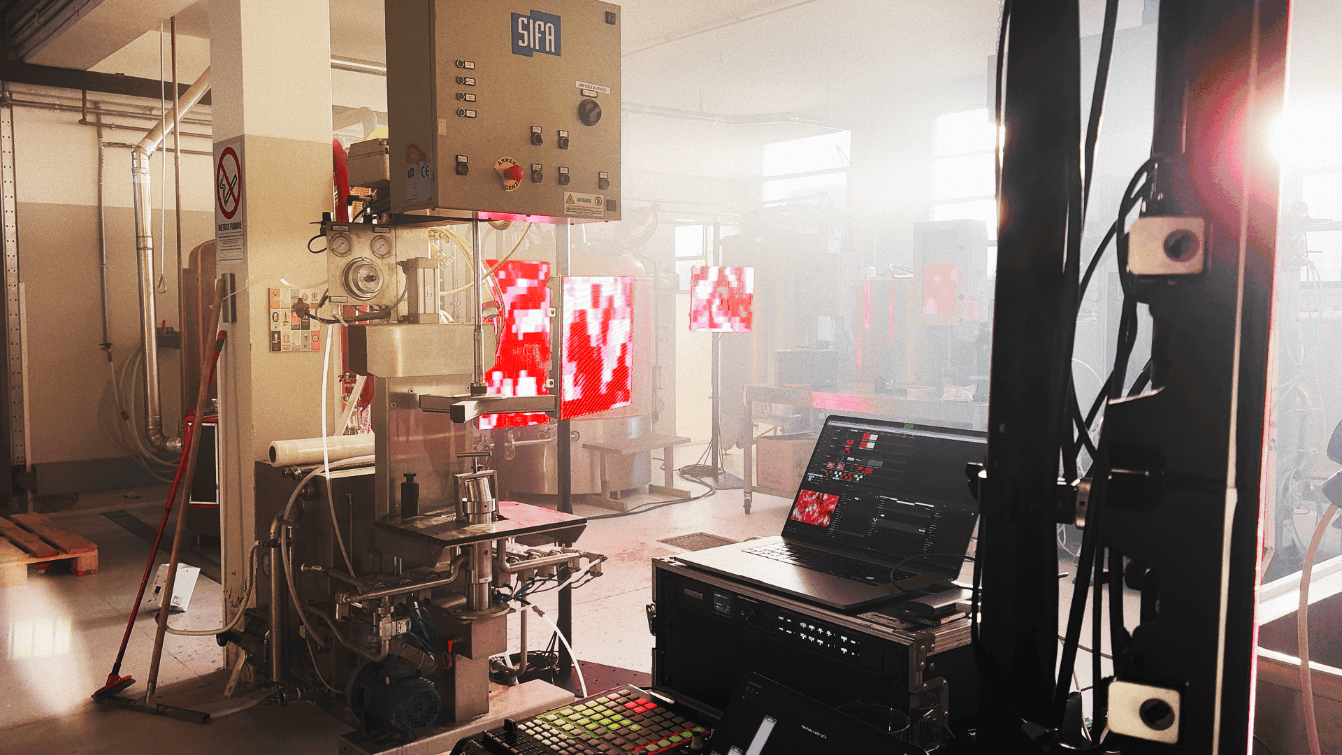 Il concept, definito dal titolo, guida ogni scelta: rosso come tensione, noise come linguaggio. L’utilizzo dei ledwall è centrale nella costruzione dell’atmosfera, diventando parte integrante della performance. L’allestimento della sala principale e dell’area DJ è stato progettato come un unico sistema coordinato, capace di amplificare l’impatto della musica live e del DJ set.